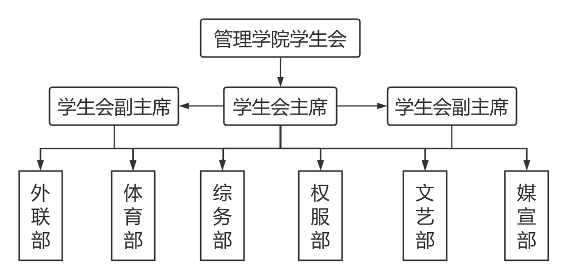 天游注册代理1958学生会设有三位主席以及综合事务部、文化艺术部、体育发展部、外联实践部、权益服务部、媒体宣传部六个部门,每位主席分管两个部门,每个部门设置三位部门负责人以及若干部员。